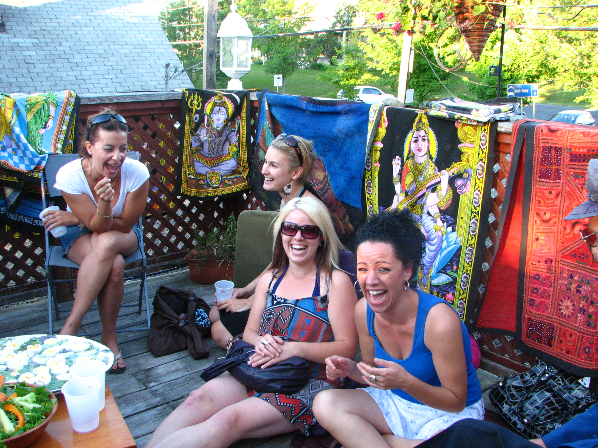 La plage est tombé à l’eau par choix et une petite crème glacée en a fait saliver plus d’une. Après ce goût de douceur, nous avons repris la route pour le prochain arrêt : Pendaison de crémaillère chez Janic Losier, artiste illuminée! Arrivées dans son logement style indien, nous avons rejoint les invités et Dieu seul sait à quel point je me suis marrée. Il y a longtemps que je n’avais pas eu la chance de voir autant de couleurs et de fraîcheur sur un balcon entouré de tapis indiens et d’enfants qui sautaient, riaient et s’amusaient dans toute leur simplicité. Ce fut l’occasion aussi pour deux de mes copines de côtoyer des gens authentiques et de vivre une expérience unique. Ann et Stéphanie, merci de m’avoir permis d’observer votre réaction et je tiens aussi à mentionner que jamais je ne vais vous offrir un bouquet de ballons. Ça s’appelle comment cette peur? La ballonaphobie!